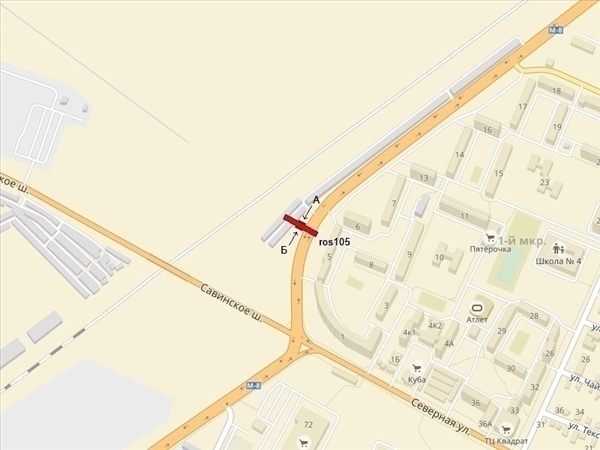 1-й микрорайон, напротив д.5, 200м до пересечения с ул.Северная и гипермаркета "Магнит" (Москва-Холмогоры автодорога М8, 208км+360м), справа при движении из Ярославля