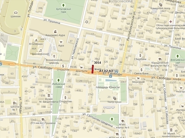 Свободы ул., 34б, ТЦ "Дом быта", напротив ТЮЗа, 100м до ТРЦ "АУРА", справа при движении из центра к ж/д вокзалу "Ярославль-Главный"