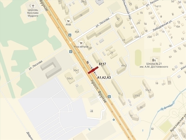 Фрунзе пр-т, 49, 300м до ул.Лескова, справа при движении в центр, к ТЦ "Фреш", гипермаркетам "Аксон" и "МЕТРО"