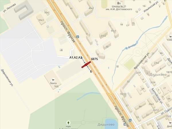 Фрунзе пр-т, 56д, гипермаркет "Лента", за ост."Дядьковская", 200м до пересечения с ул.Ярославская, справа при движении из центра (сторона Б - в центр, к гипермаркетам "Метро" и "Аксон")