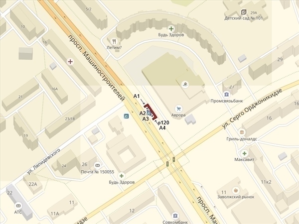 Машиностроителей пр-т, ост."Кинотеатр "Аврора", в районе пересечения с ул.С.Орджоникидзе, у ТЦ "Аврора" и фитнес-клуба "Loft Fitness", справа при движении к пр-ту Авиаторов