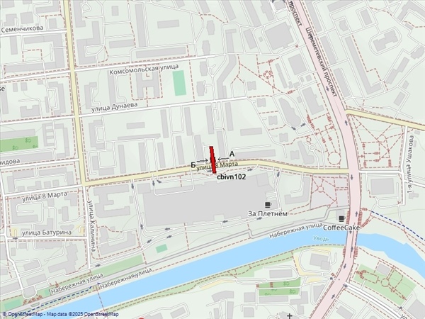 8 Марта ул., между дд. 27 и 29, напротив ТРЦ "Серебряный город", справа при движении к пр-ту Ленина